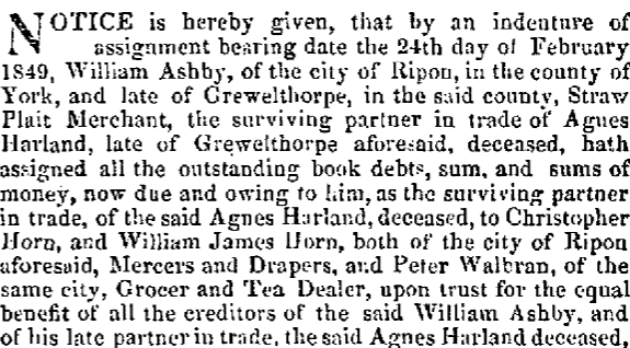 AGNES HARLAND. Born C1789. In 1841 living Grewelthorpe. A straw Plait dealer.
