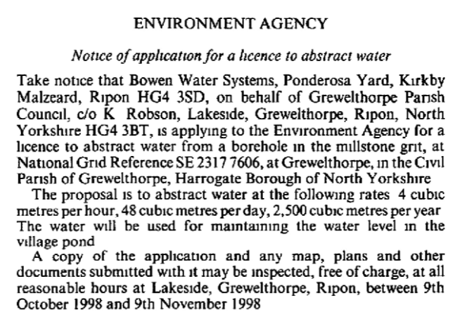 For many years the pond would dry up in exceptionally dry weather. To overcome this problem Parish Councillor Keith Robson undertook to research and install a borehole.