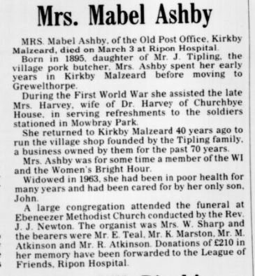 Letter from Janet Cox August 2015. Last year I read Paul Nicholson’s query about the Robert and Mary Elizabeth Ashby that he used to stay with in Scotton but at the time I couldn’t see a connection with my Ashbys. However, I now know that his Robert was actually William Robert Ashby and married to Mary Elizabeth Roberts. William Robert was the second son of Arthur Ashby and Ann Kirkley and thus a relation of mine. I found William Robert and Mary living with their daughter Mildred Ann at 4 Nidd View Cottages in Scotton in the electoral registers from 1932-1940.
