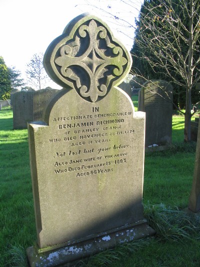 BENJAMIN RICHMOND. Born C 1794 Carlsmoor. Died 28.11.1874. Buried 1.12.1874. M.I. Husband of Jane. Farmer at Bramley Grange.