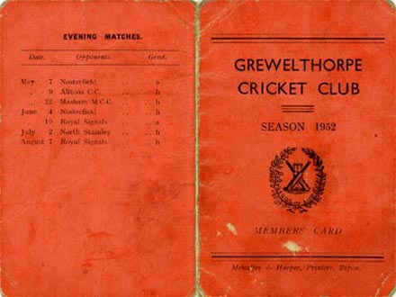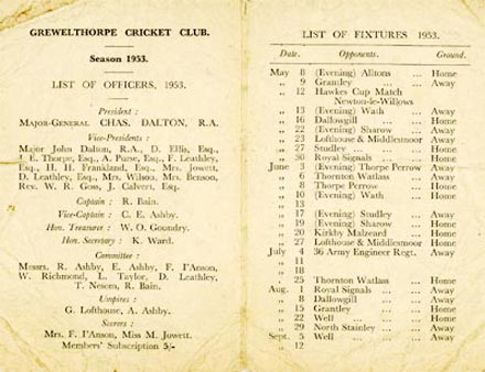 In April 1938 the Annual Cricket Club meeting was held in the Reading Room, Grewelthorpe.Elections took place. President. Captain Charles Dalton. Vice Presidents. J.D.A.Dalton. D.Ellis. J.W.Hawkin. J.F.Reid. J.Thorpe. E. Crabtree. W.L.Trenholme. C.Dent. A.Purse. A.Taylor. T.Lickley. The Secretary reported that there had been 17 matches last season. 8 had been won and 9 lost. The prize for the best Batting and Bowling was awarded to S.Lofthouse. and the Fielding Prize was awarded to J.Patchett.