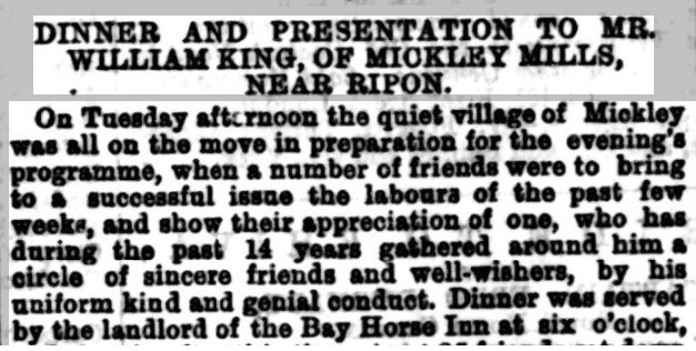 In 1877 Mr King the manager of Mickley Mill resigned his position. He was presented with a gold watch, a purse of money and a testimonial his wife was presented with a silver biscuit barrel. He had been manager for 14 years.
