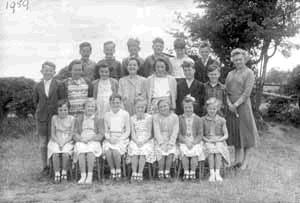 Back Row. Miss Minnie Jowett. Mrs Richmond. Walter Myers. Nellie McDonald. Freda Thompson. Mrs Ashby. unknown. Mrs Calvert. unknown. 2nd row adults. Barbara Fenwick. Ann Fairnington. Evelyn Frankland. Mary Jones. Children. Ann Myers. Peter Lofthouse. Nigel Hutchinson. Jane Robertshaw. Moira Boynton. Claire Lofthouse. Shirley Pickles. Anita Binks. John Richmond. John Binks. Peter Richmond. Front Row. Jacqueline Frankland. Carol Pickles. Brian Fenwick. Mrs May Stelling.