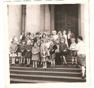 School trip to London about 1951. Adults L to R. Mary Jowett. Minnie Jowett. Mrs Ashby. Mrs Hall. Mrs. Stelling. Mrs. Ward. Miss Dorothy Goundry. Meg Bain. Emma Bain.Children L to R. Malcolm Stelling seated. Elizabeth Hall. Ivan Chamberlain. Brian Simpson behind Kevin Ward [small boy at front] Joan Hewitt. Avril Stelling behind Stella Richardson [white ribbon] Mervyn Bain. Brian Ashby.